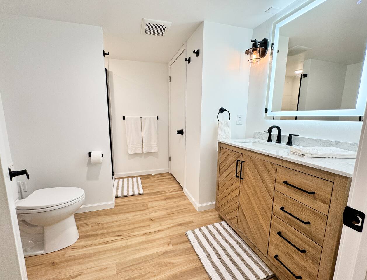 Bathroom 2 (Basement) – Newly updated with a walk-in shower, hotel-style toiletries, lighted anti-fog mirror, and makeup removal towels.