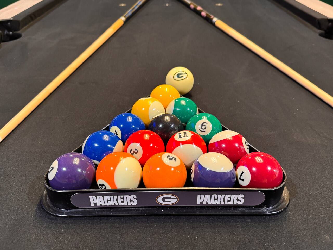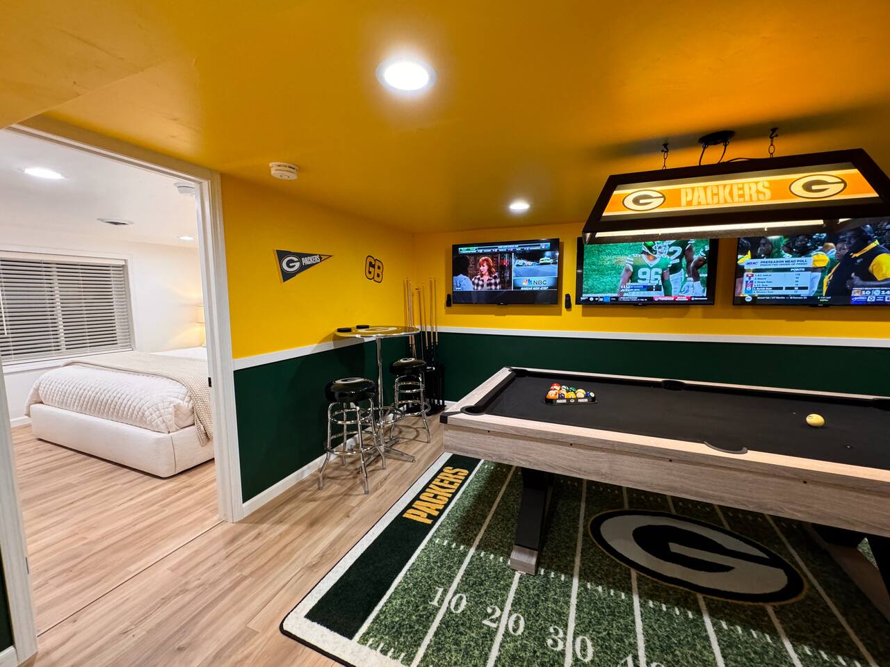 ✔ Packers-Themed Game Room – Enjoy a pool table, three 50" Roku 4K TVs, pub tables, and a Golden Tee video game.