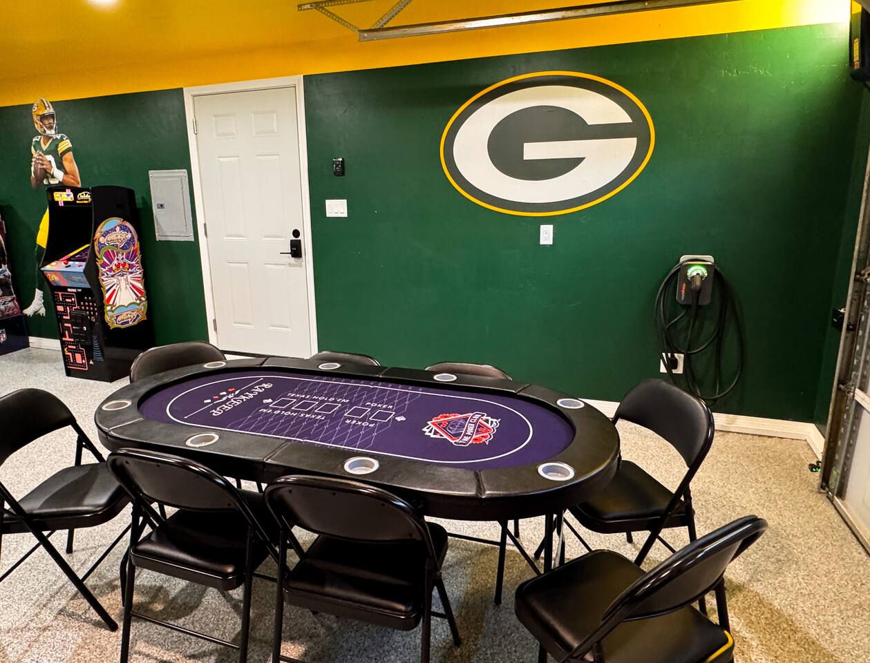 Garage Tailgating Lounge – Includes air hockey, poker table, arcade games (Ms. Pac-Man, NFL Blitz, Wheel of Fortune), and a Green Bay Packers bar with seating for four.