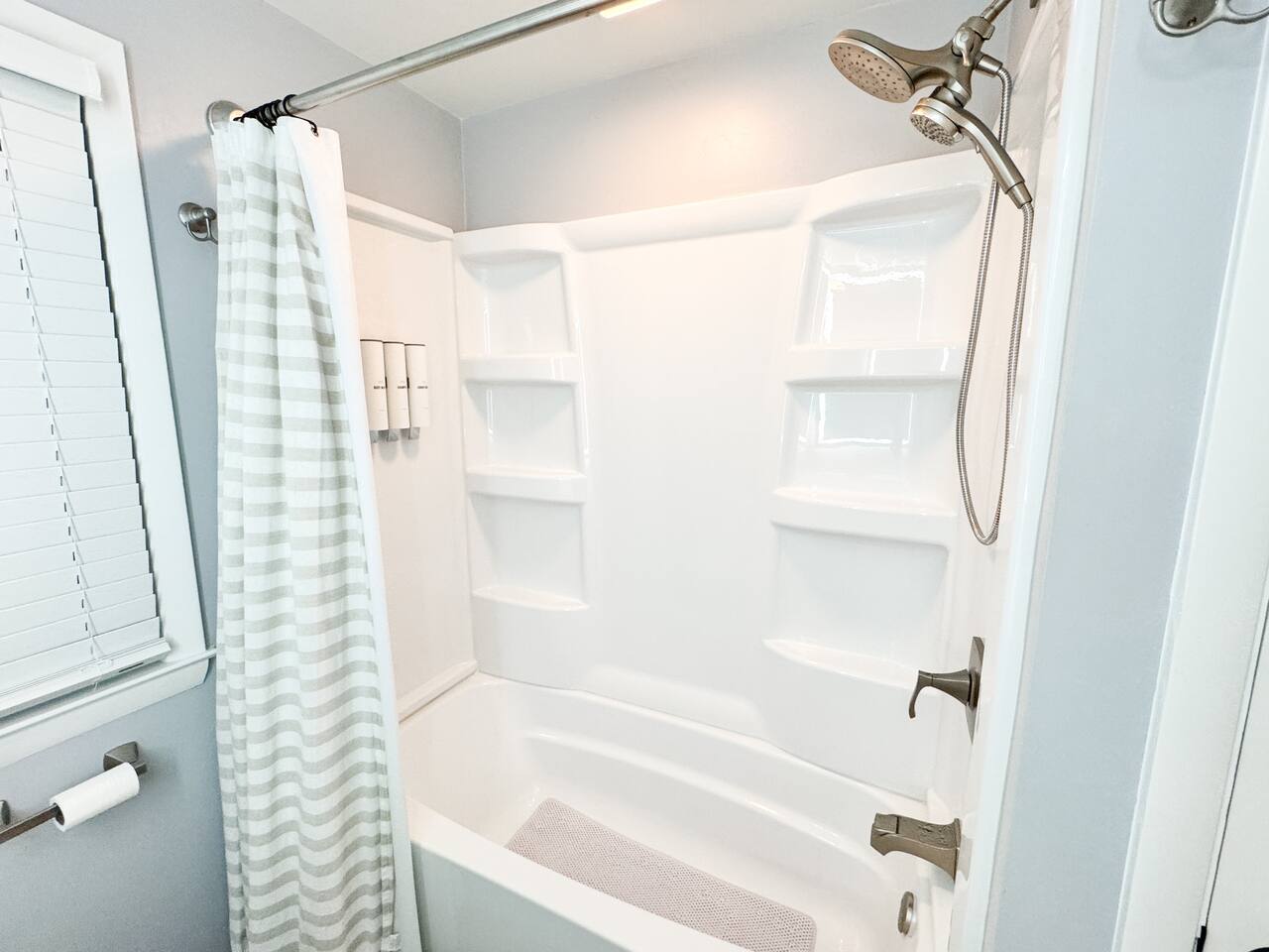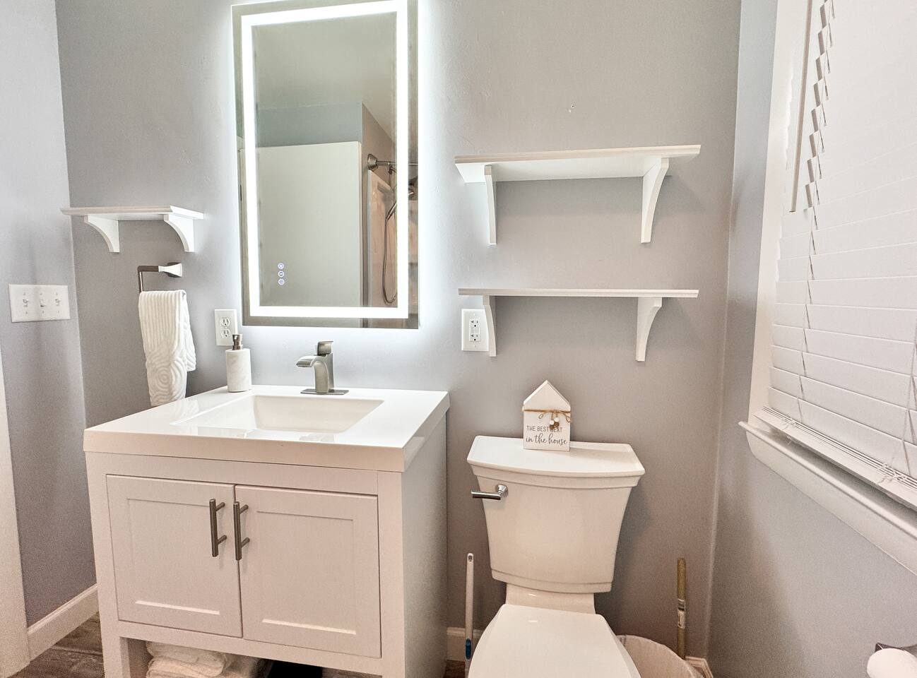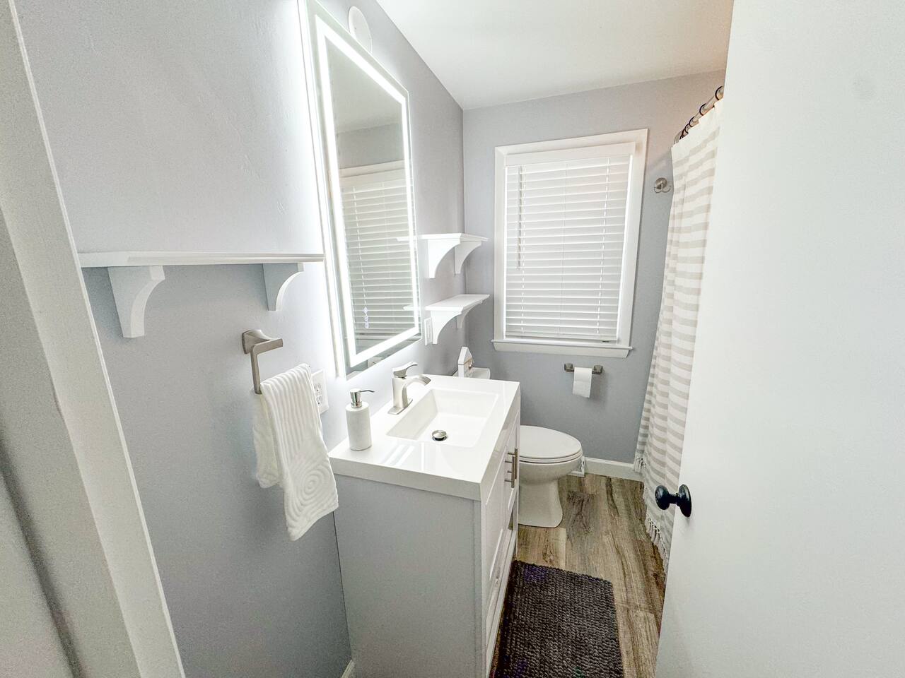 Bathroom 1 (Main Level) – Recently renovated with a tub/shower combo, hotel-style toiletries, lighted anti-fog mirror, and makeup removal towels. A hairdryer and first-aid kit are also available.