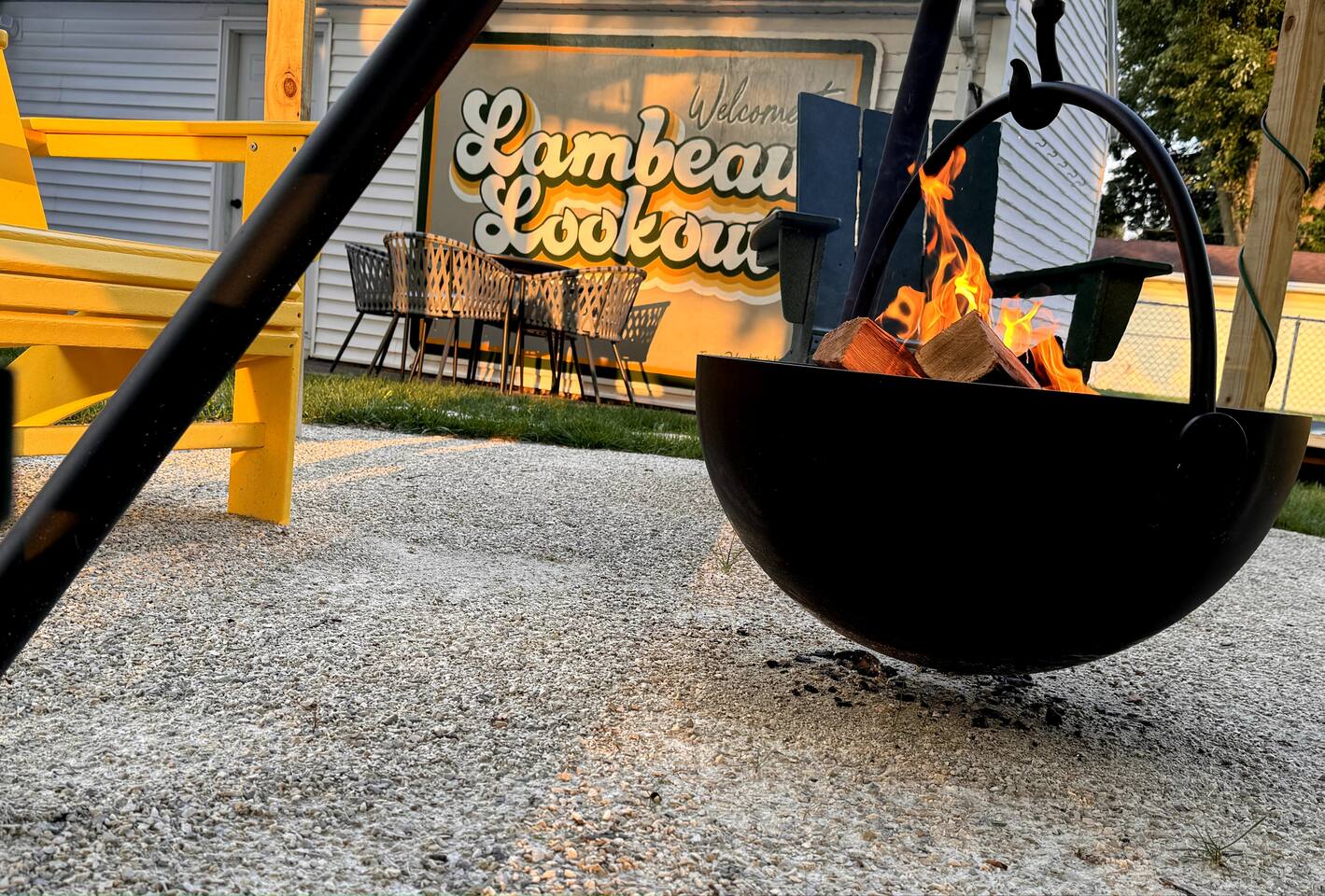 Cauldron-style fire pit with cozy string lighting and Polywood Adirondack chairs for a perfect evening vibe. Propane gas grill with all necessary utensils for a great BBQ.