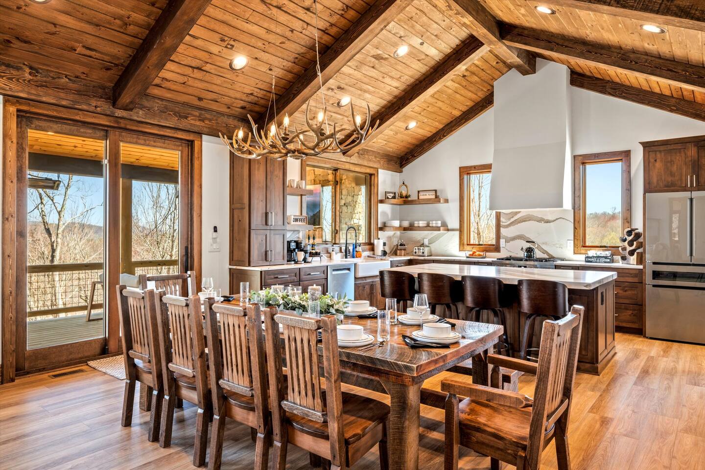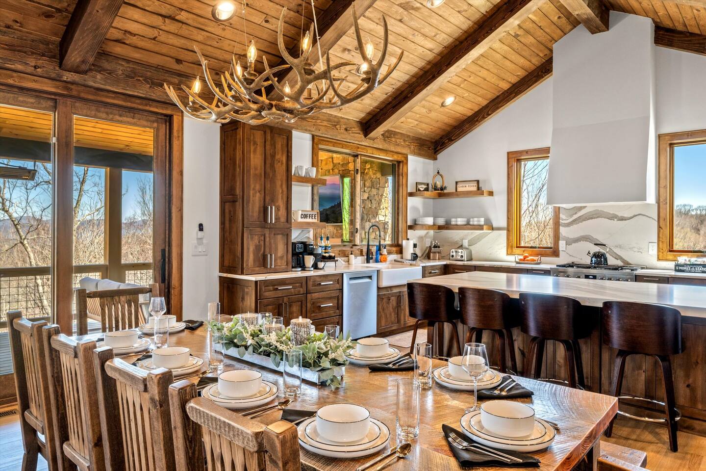 The cabin features a fully stocked kitchen, 4 bedrooms (3-King/4-Twins), and 4 full bathrooms (heated floors and toilets), plus a game room with a pool table and arcade games.