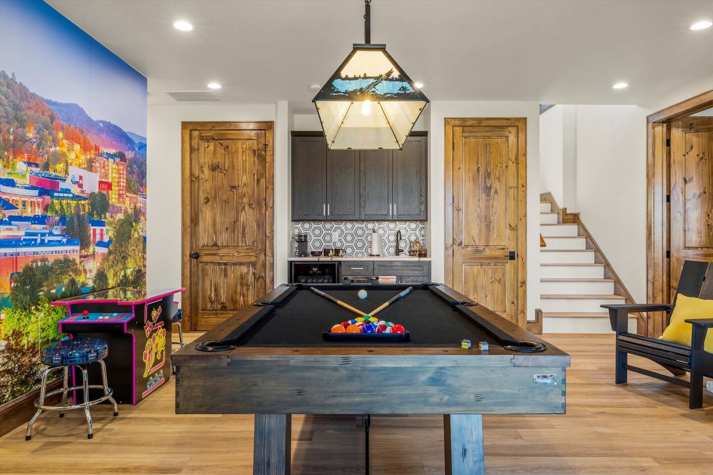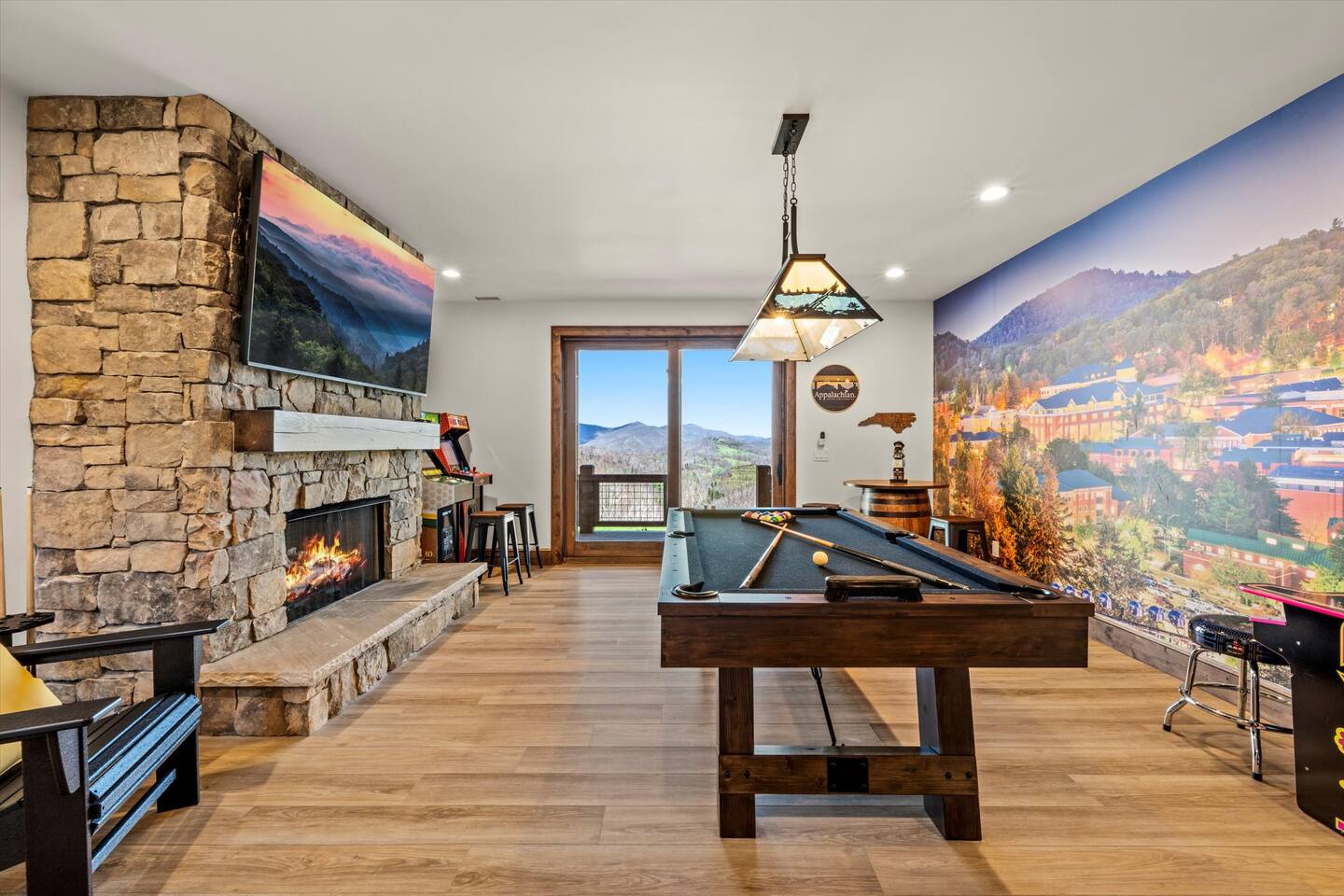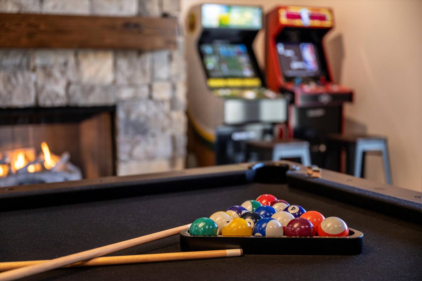 • Game Room – pool table, fireplace, 75” Smart 4k TV, Ms Pac-Man, Golden Tee 3D and NBA Blitz Basketball arcade games