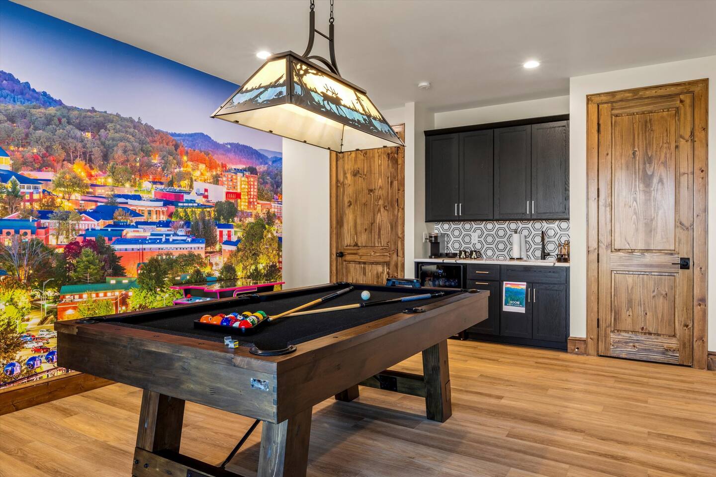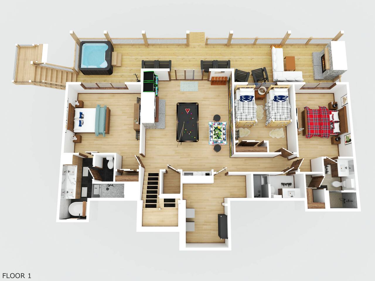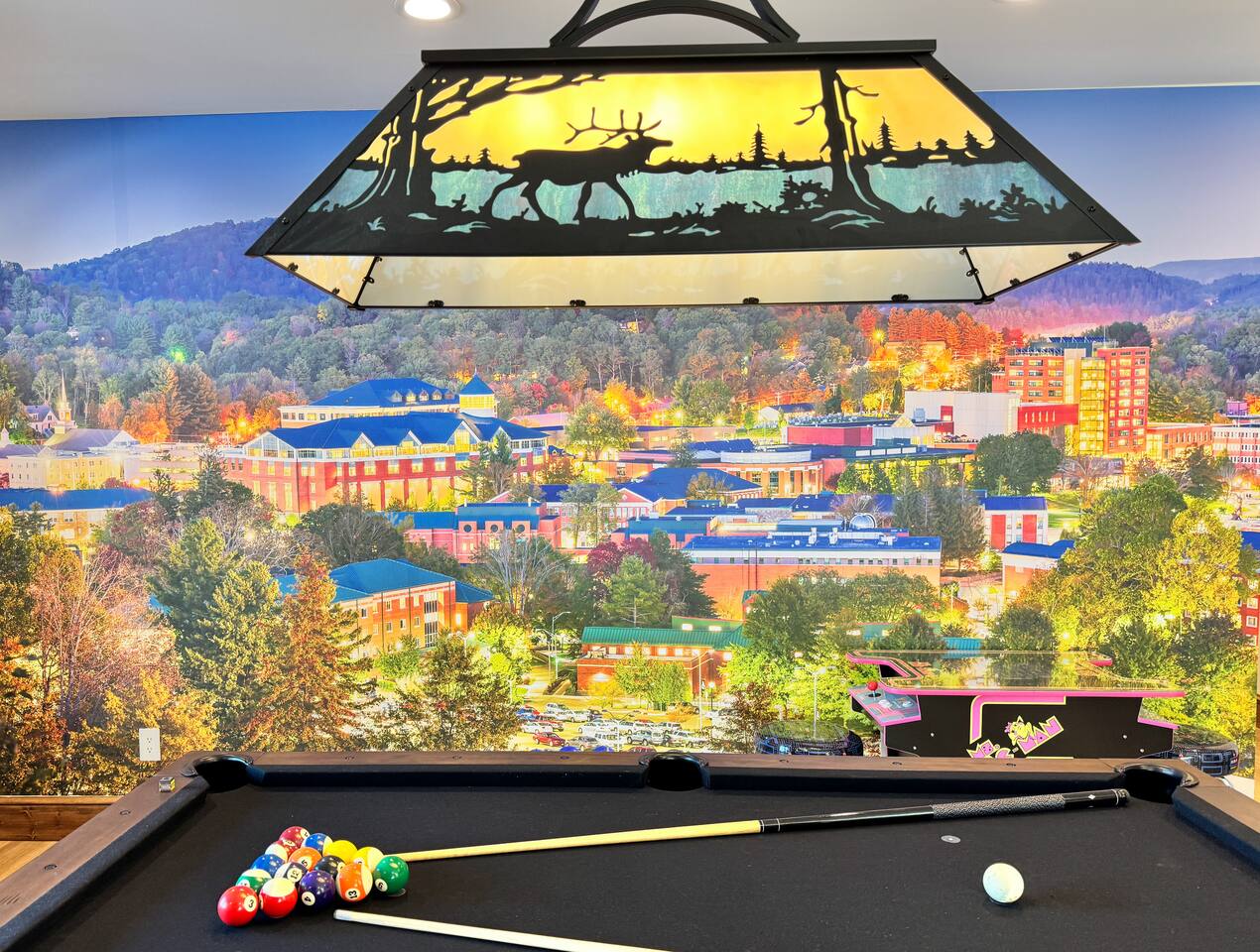 • Game Room – pool table, fireplace, 75” Smart 4k TV, Ms Pac-Man, Golden Tee 3D and NBA Blitz Basketball arcade games