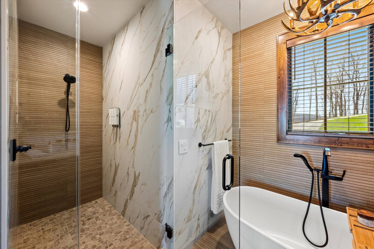 • Lower Deck – gas fireplace, 65” Smart 4k TV, Hot Tub for 7