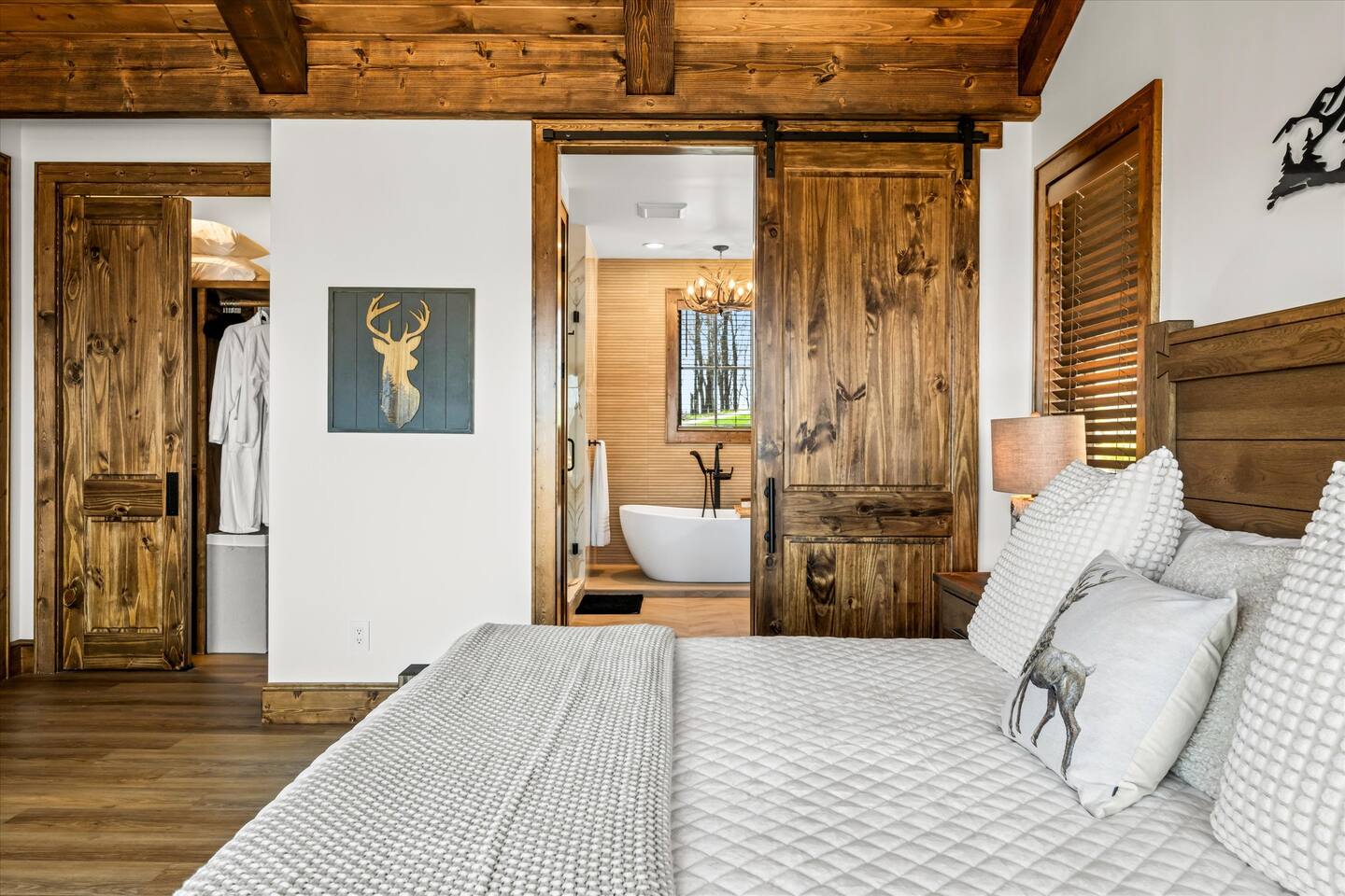 • Bedroom 1 – luxury Leesa KING bed, 65” Smart 4k TV, sliding door to outdoor deck, electrical and USB outlets on each side of the bed